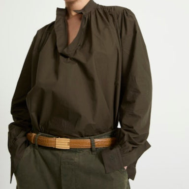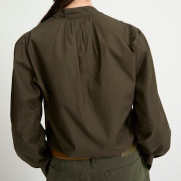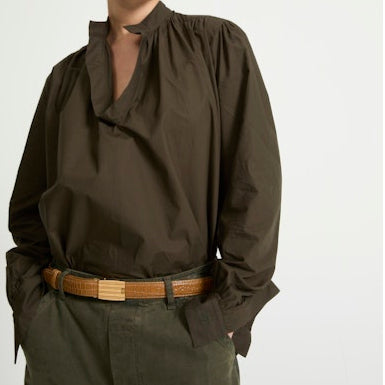 Fold marked along the leg, puffy sleeves, buttoned cuffs, Mao collar. Fancy buttons, tile prints.