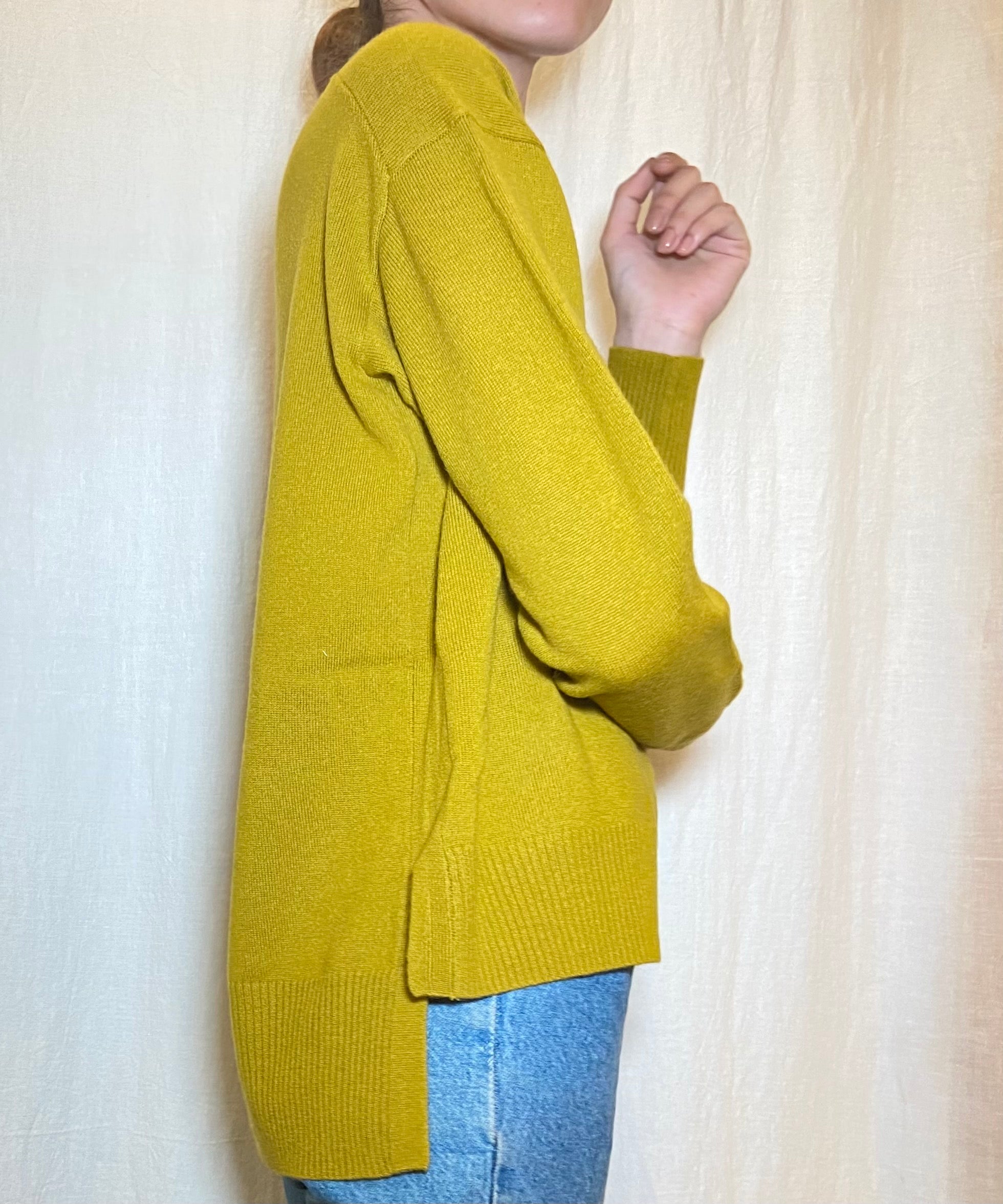 A modern sweater shape with a longer length in the back to reach the buttocks and small slits on the sides.