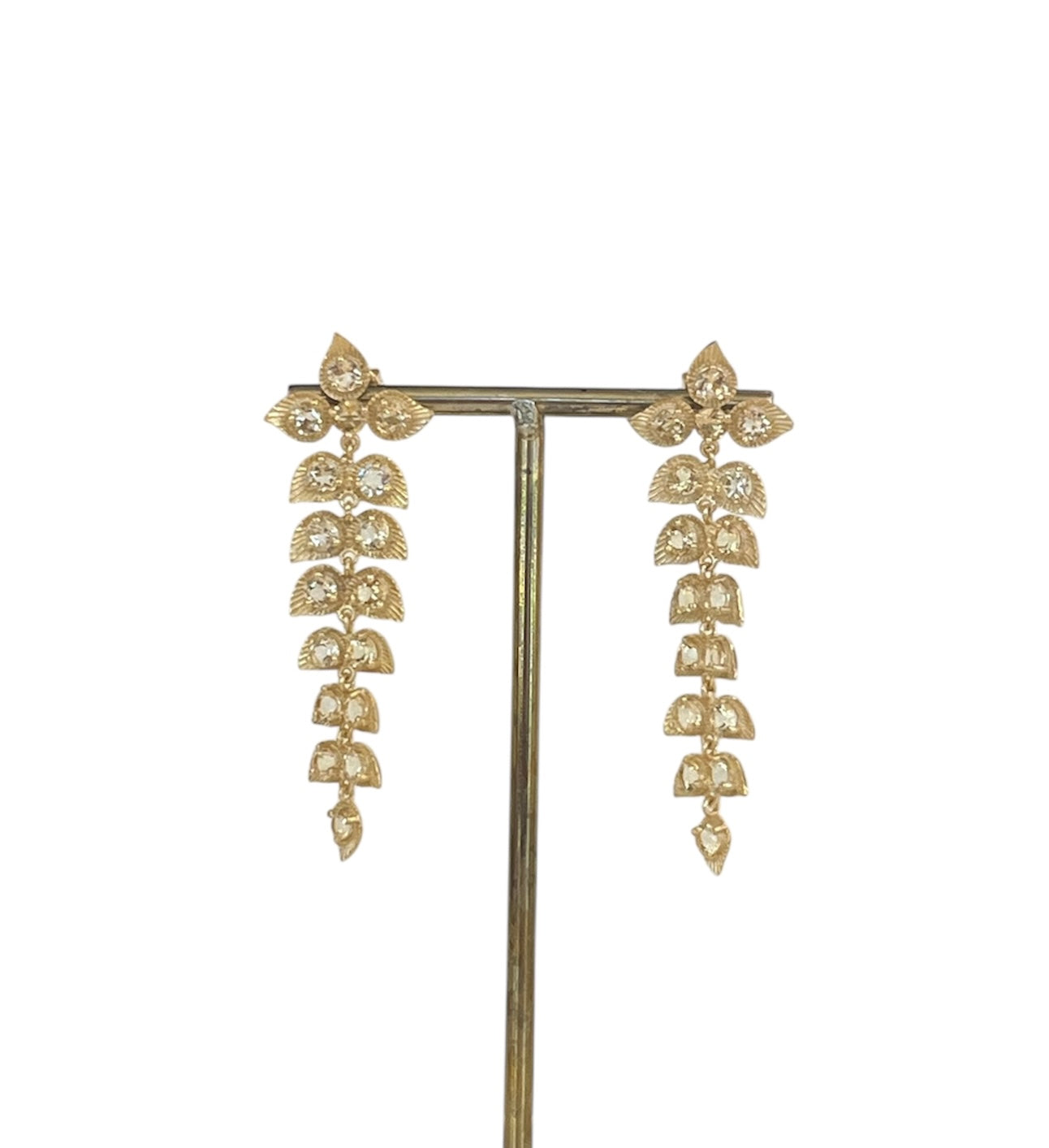 Description: Pair of gold plated pendant earrings adorned with Lemon quartz.