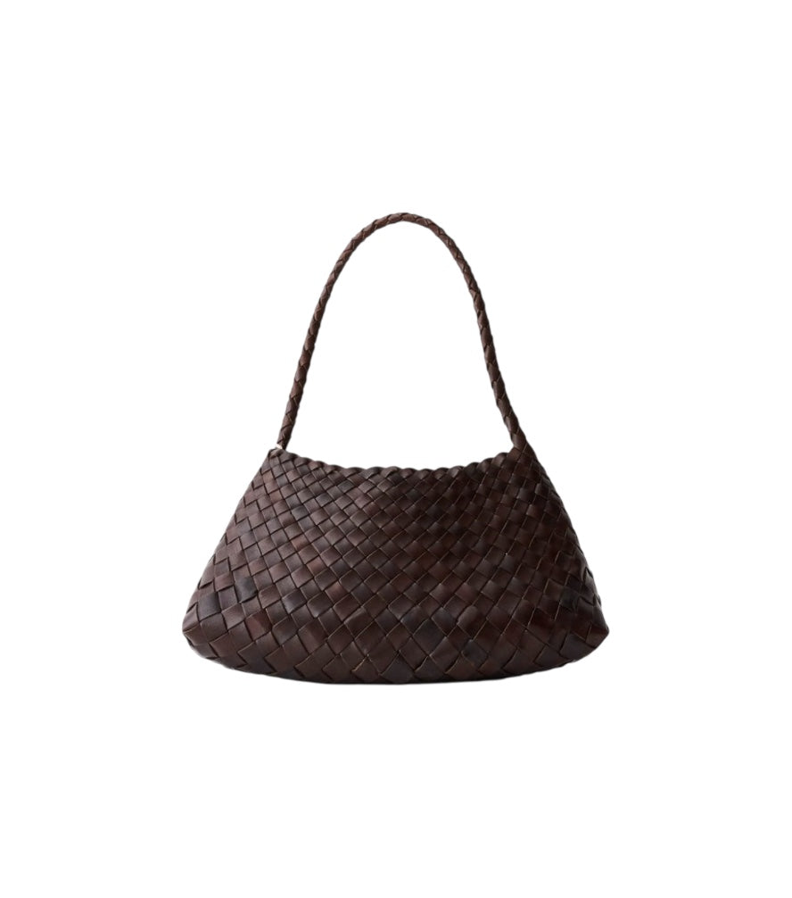 Small dark brown woven leather bag with a single strap, can be worn on the shoulder or carried by hand.