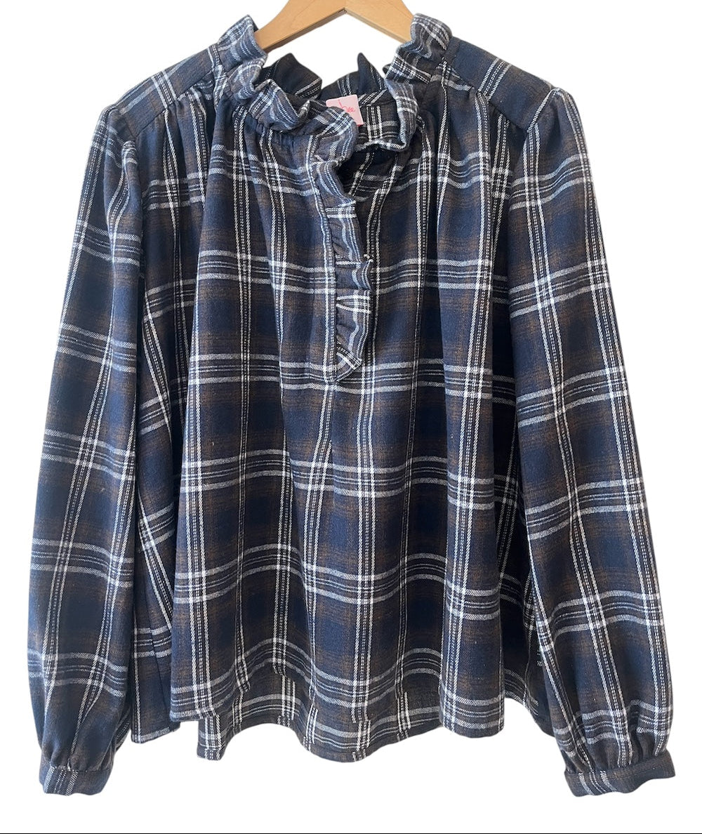 Blouse à carreaux dans les tons bleus et marrons foncés avec col volanté