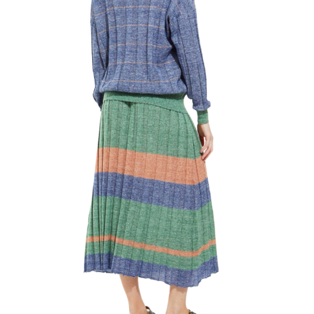 The Lisa Jaspe Tan Bleu skirt is made from a mottled wool and linen knit with a pleated effect. It has an elasticated waistband and a straight cut.