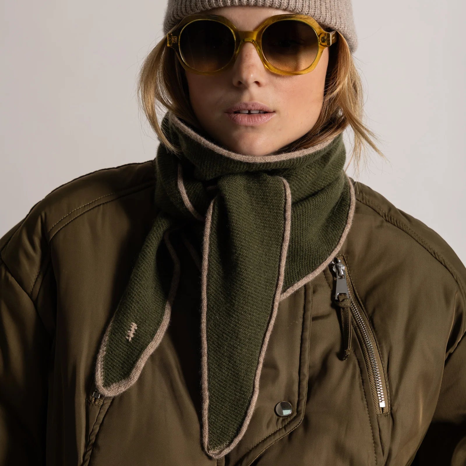 Mini scarf kaki 100% cachemire coloris kaki avec bords beige.