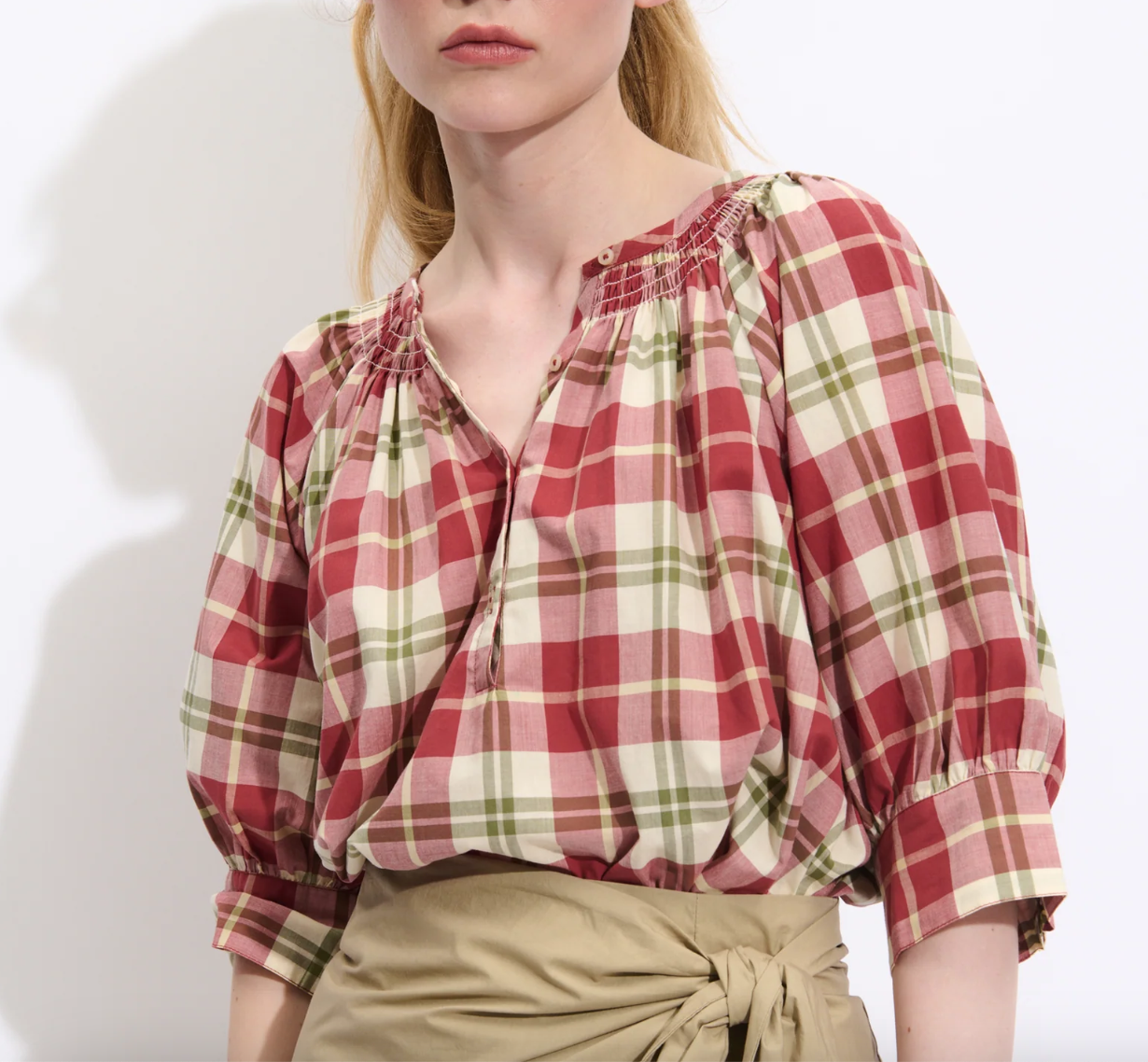 This short-sleeved blouse is embellished with ruching under the shoulder panels, with a tightening at the waist and a front buttonhole.It combines style and comfort.
