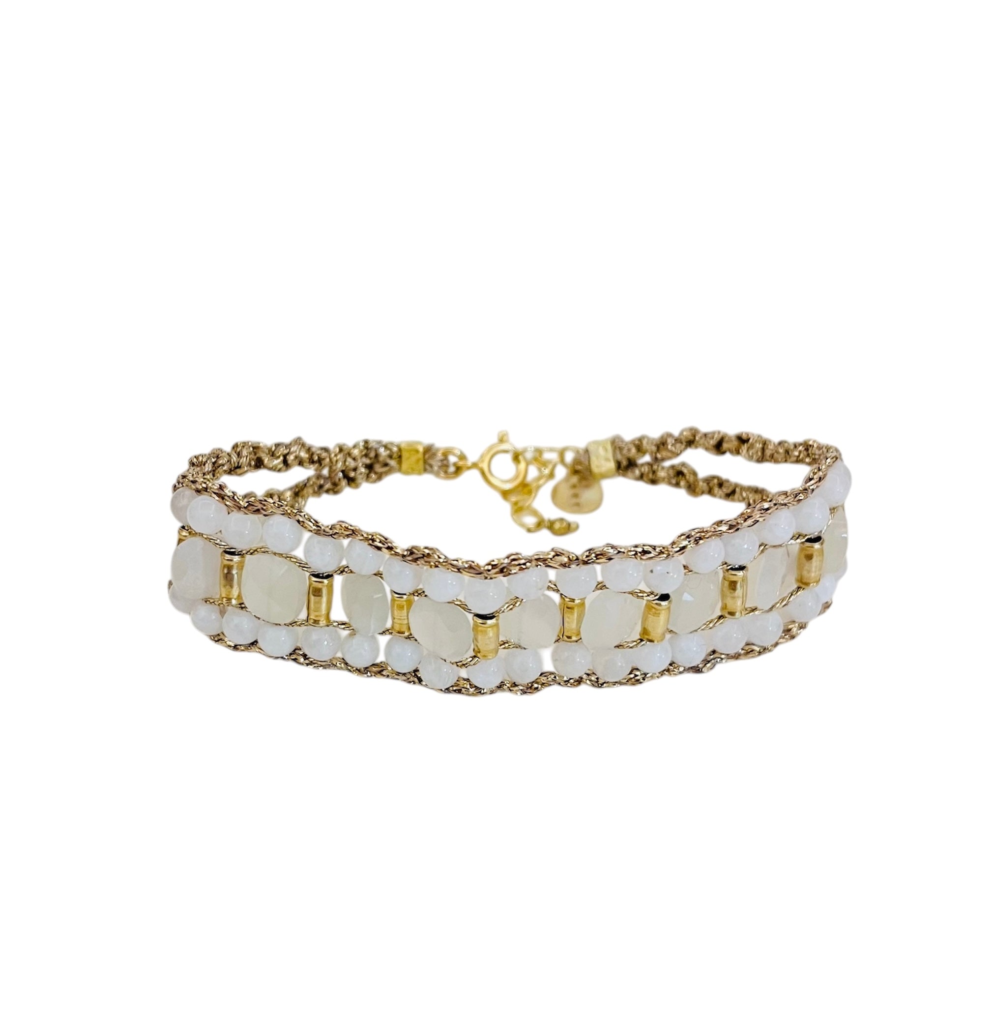 Bracelet composed of a 1cm wide woven band in gold-plated silver, adorned with green angelite gemstones.
