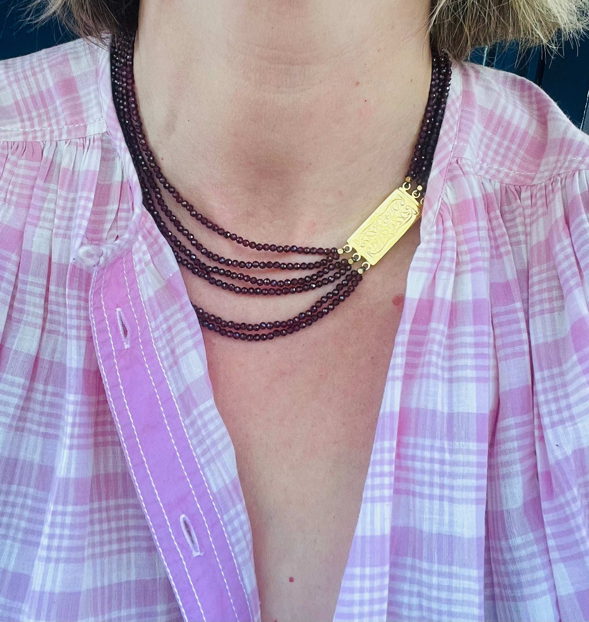 This is BR's first elephant in amazonite, and its eye, Ayin, is made of labradorite and garnet on a gold-plated silver chain.