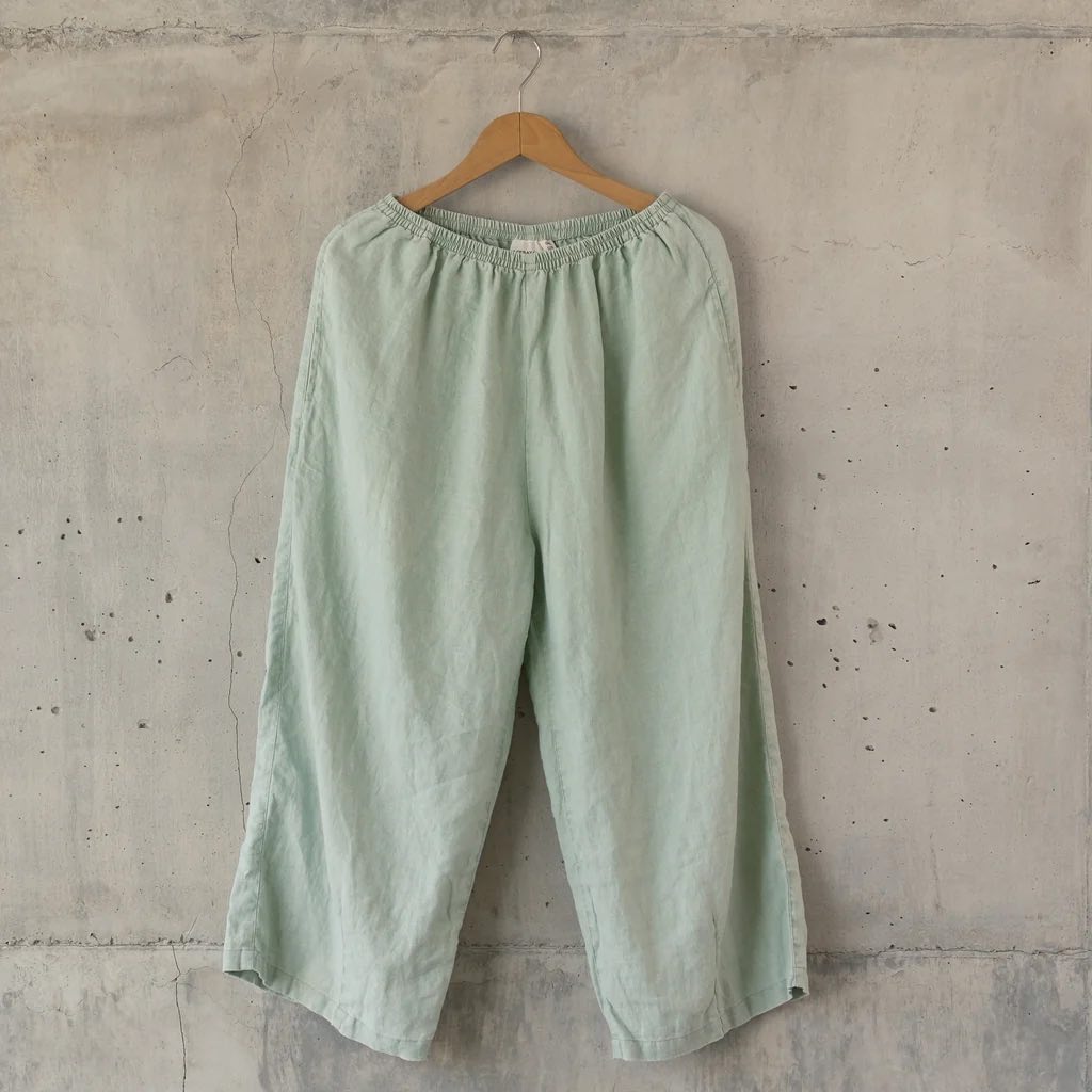 The nude-coloured Emas trousers in baclu cotton with elasticated waistband are comfortable and light all day long.