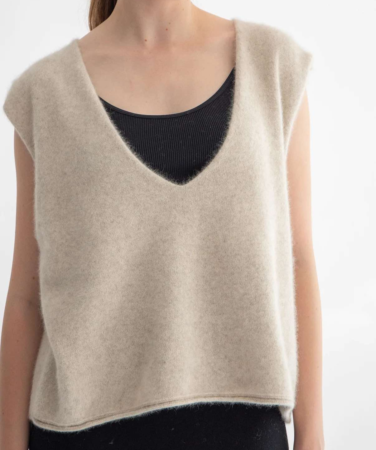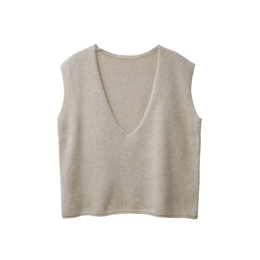 Ce pull sans manches avec col V profond couleur ivoire peut être associé avec une chemise ou un pull fin.