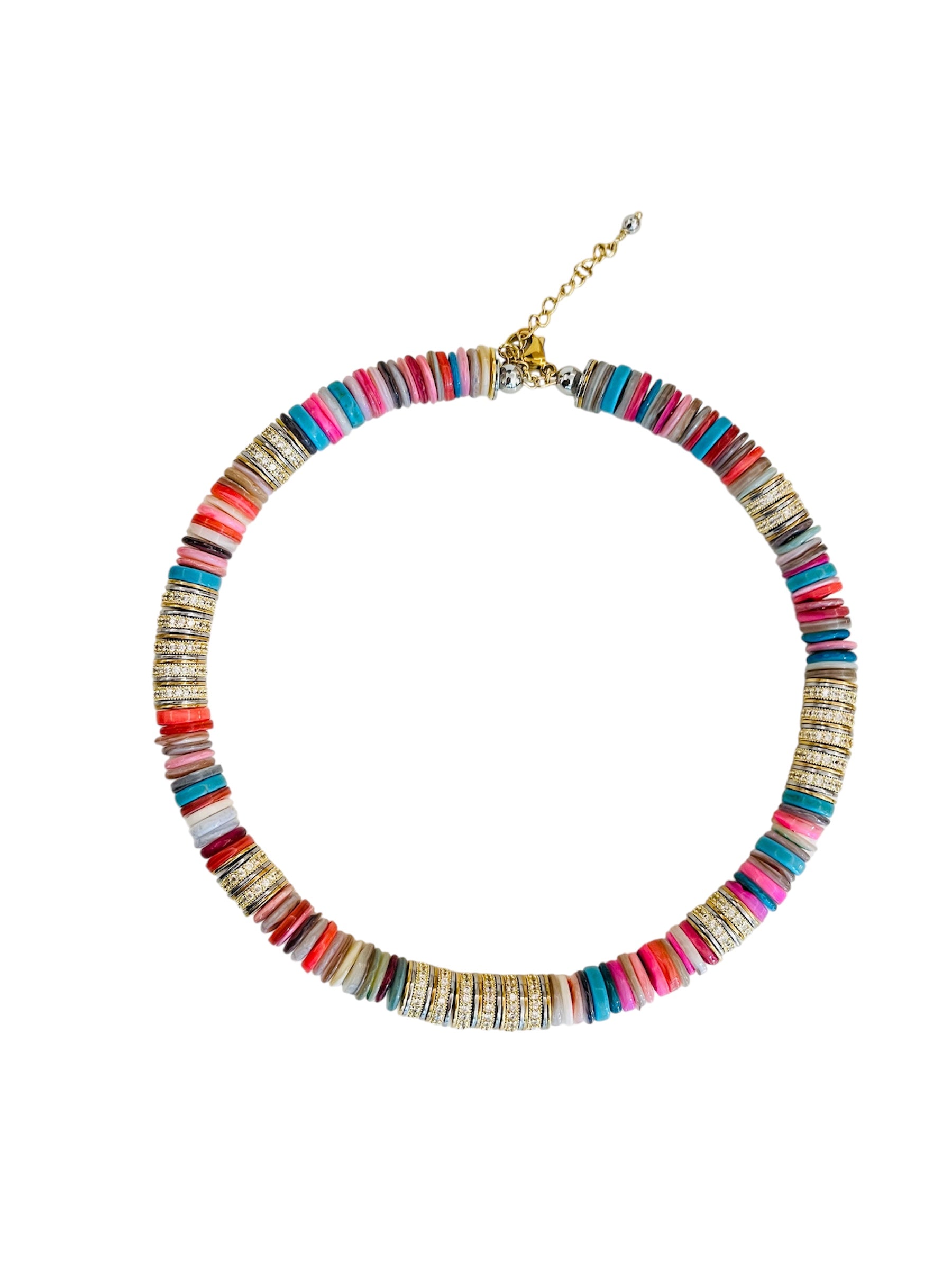 Collier réglable composé de perles en bois, dorées et d'oxydes de zirconium sur une monture structurée.