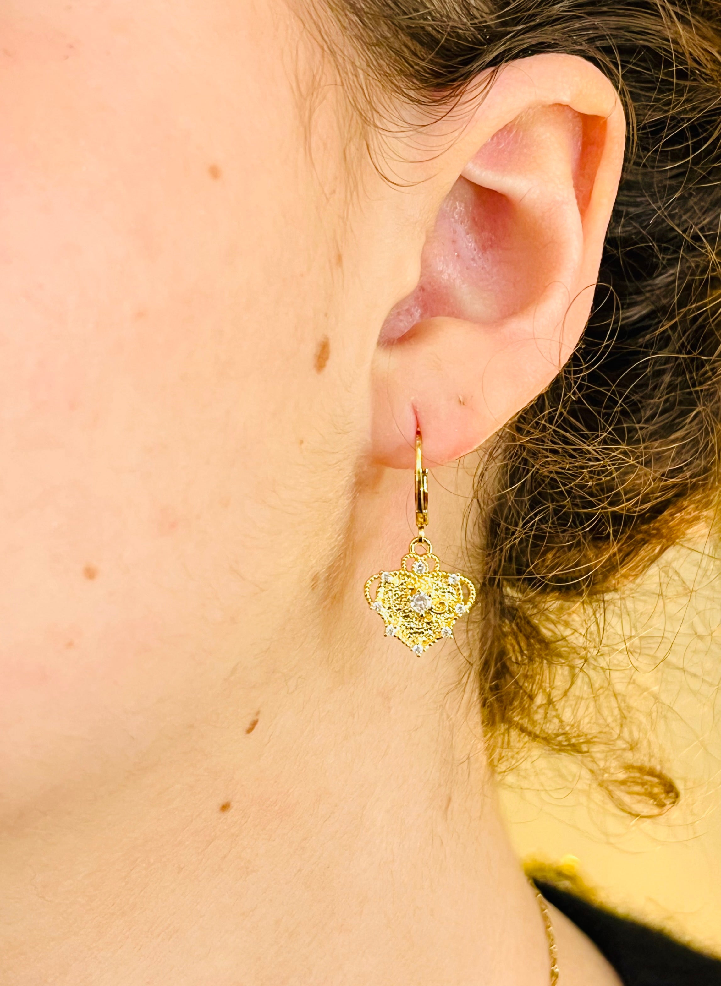 Pair of 18 -carat gold -plated golden earrings with a flower set with a pink zirconium in its center and brown zirconiums around.