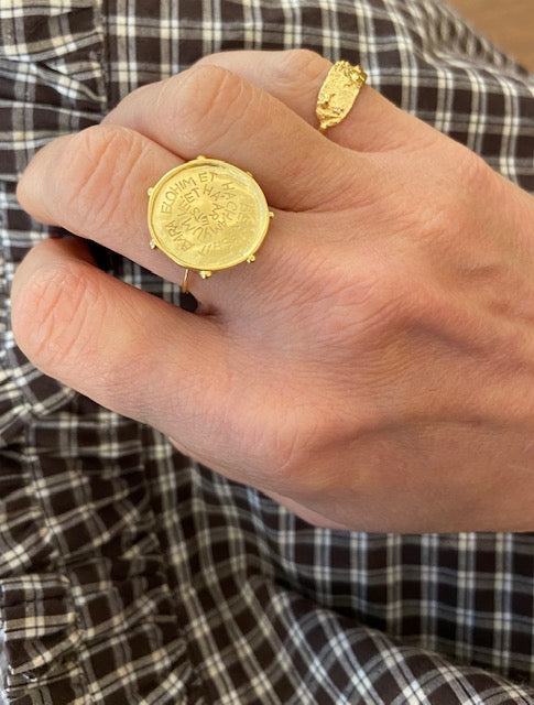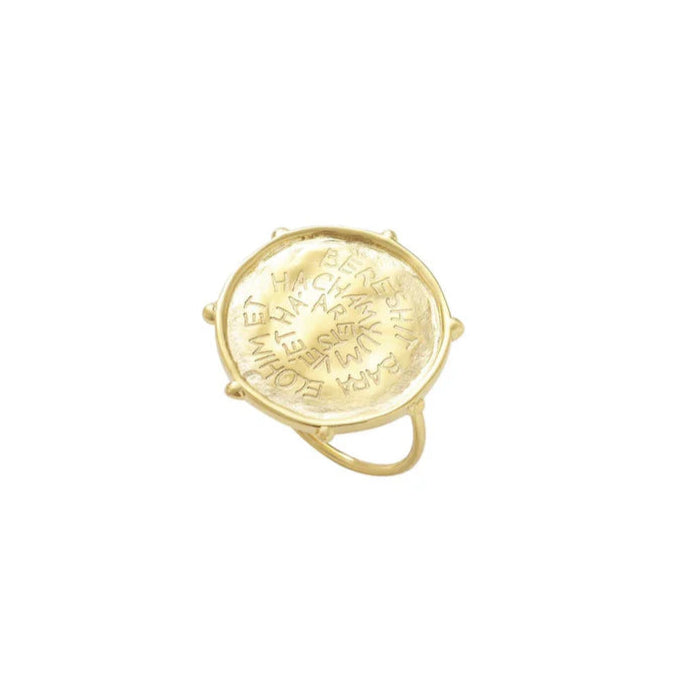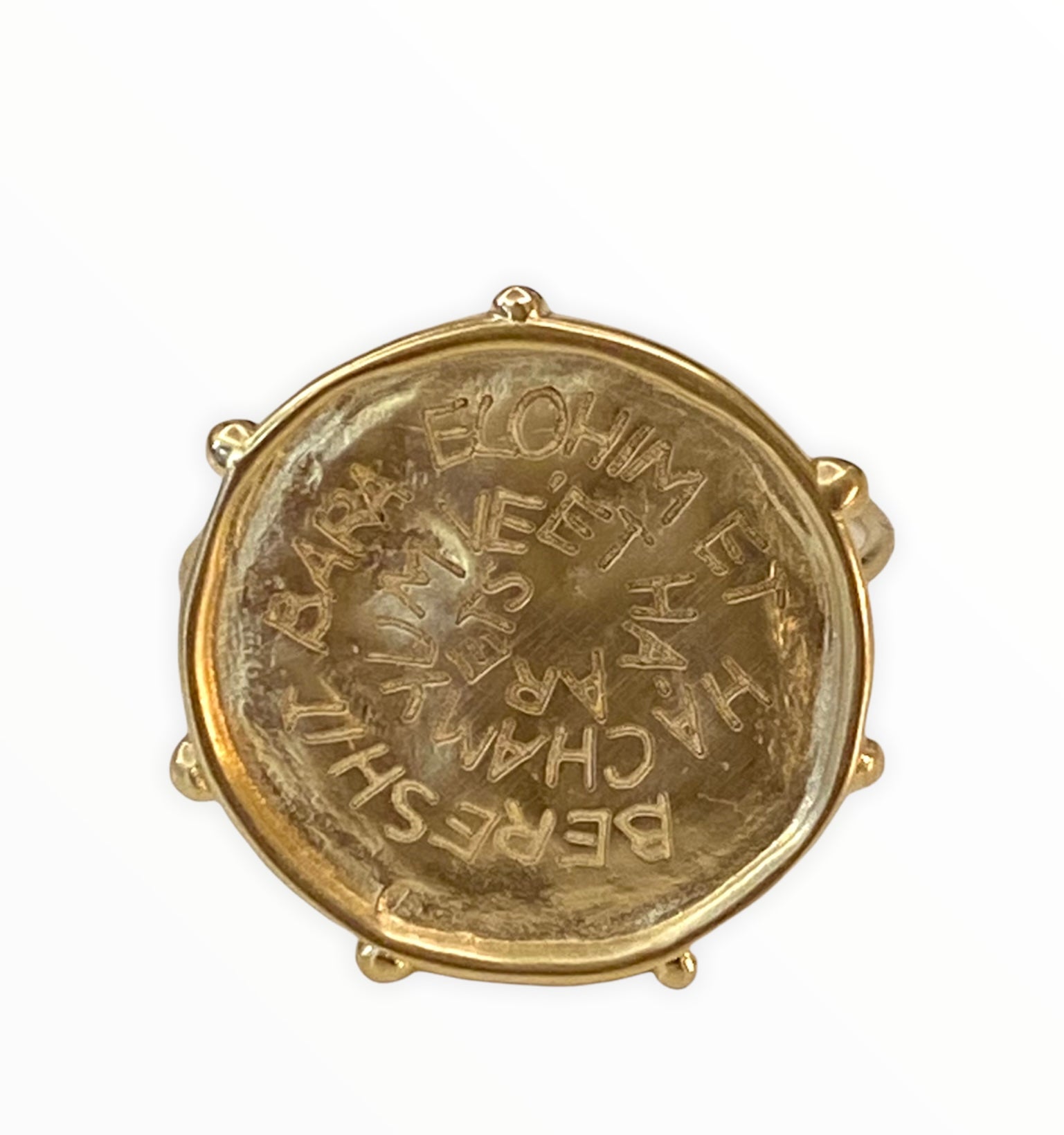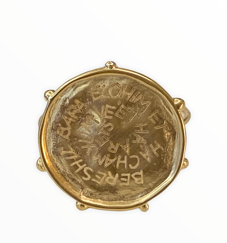 The coin has a phonetic Hebrew message: "In the beginning God created the earth".