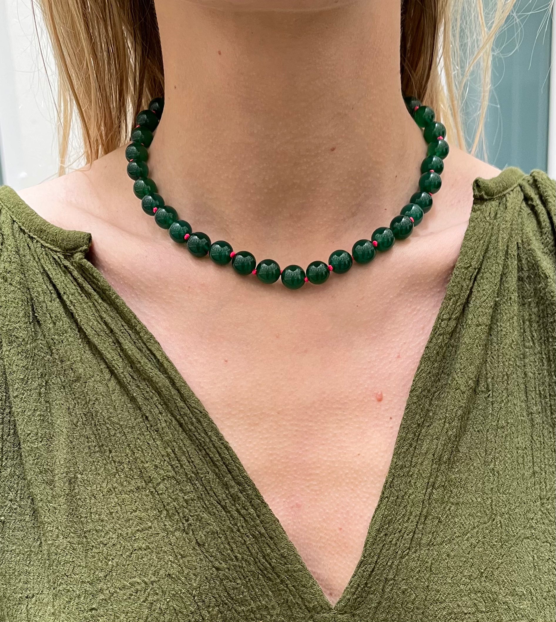 The Rainbow necklace in green agate on neon pink thread with gold-plated clasp will add a splash of colour to your look.
