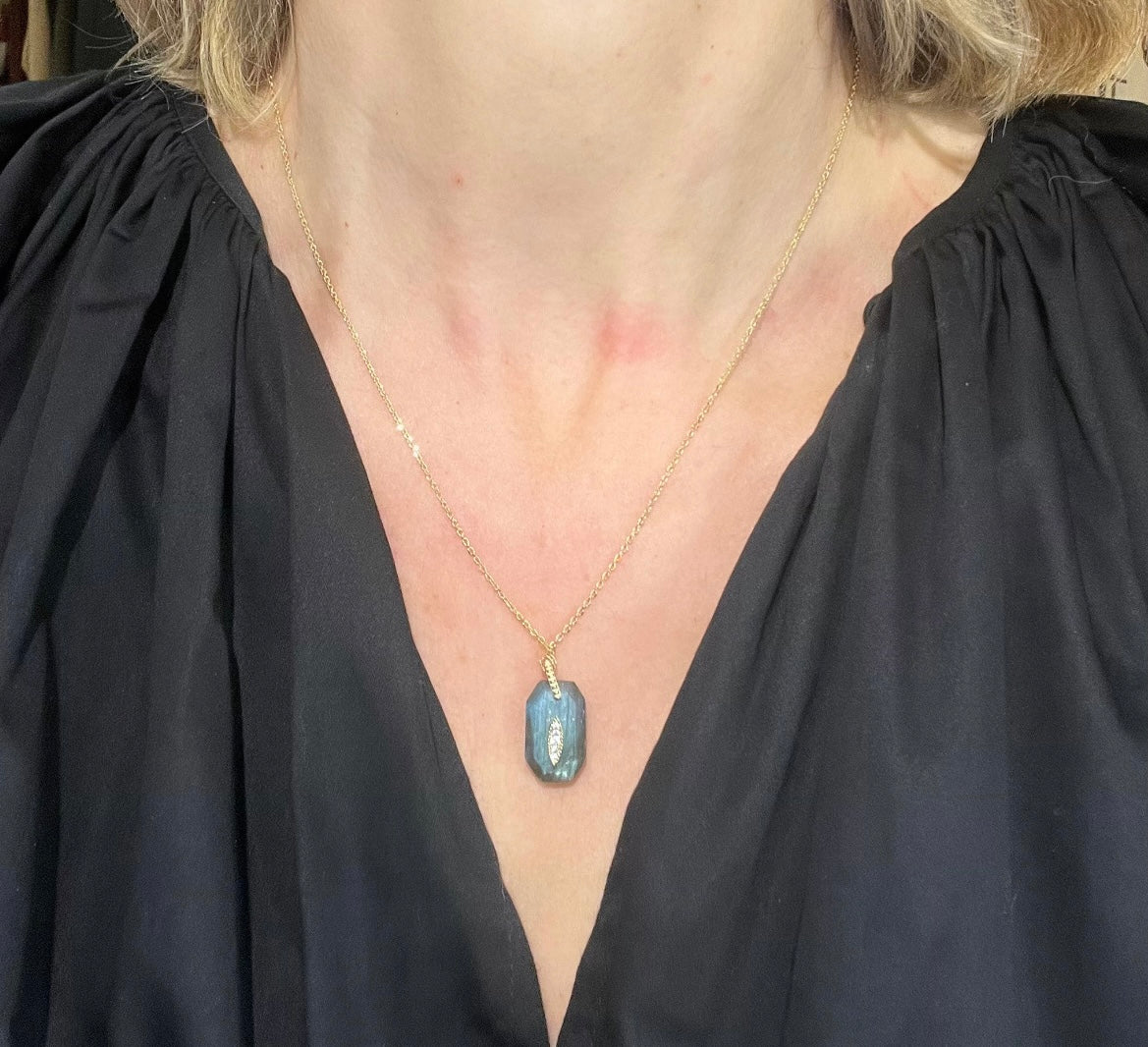 Necklace with a gold plated chain and in its center a semi precious stone in labradorite. A white zirconium inside.