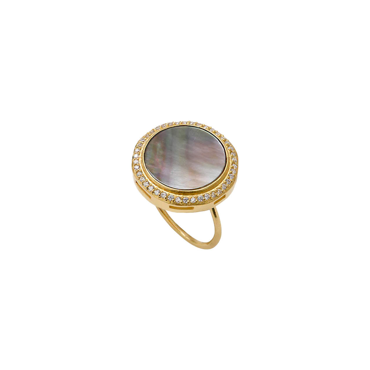 . Description : Round ring composed of mother -shaped mother -shaped with blue gray reflections. It is decorated with white zircons around.