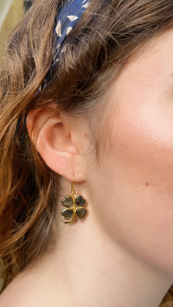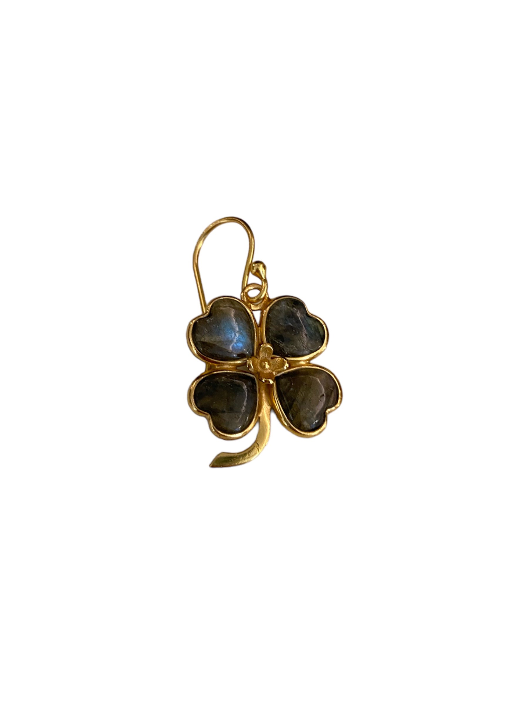 C'est un petit trèfle porte bonheur en labradorite et argent plaqué or 5 microns.