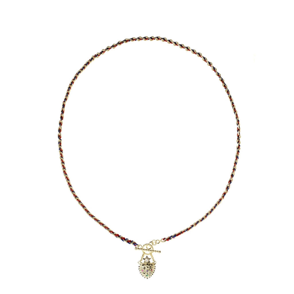 925 silver braided necklace composed of a golden twisted lin chain and blue and red silk threads.