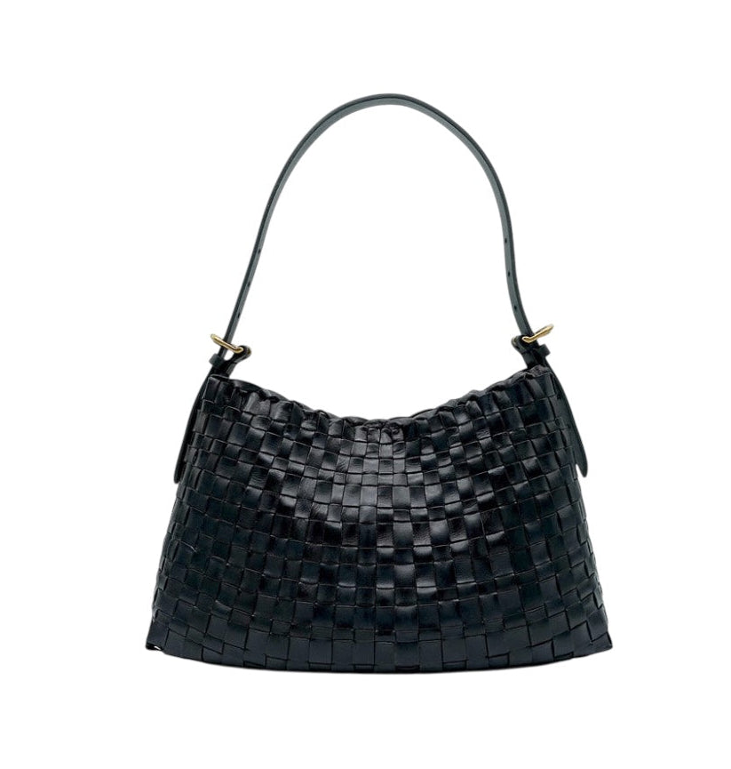 Woven leather bag with a single shoulder strap, worn over the shoulder or by hand