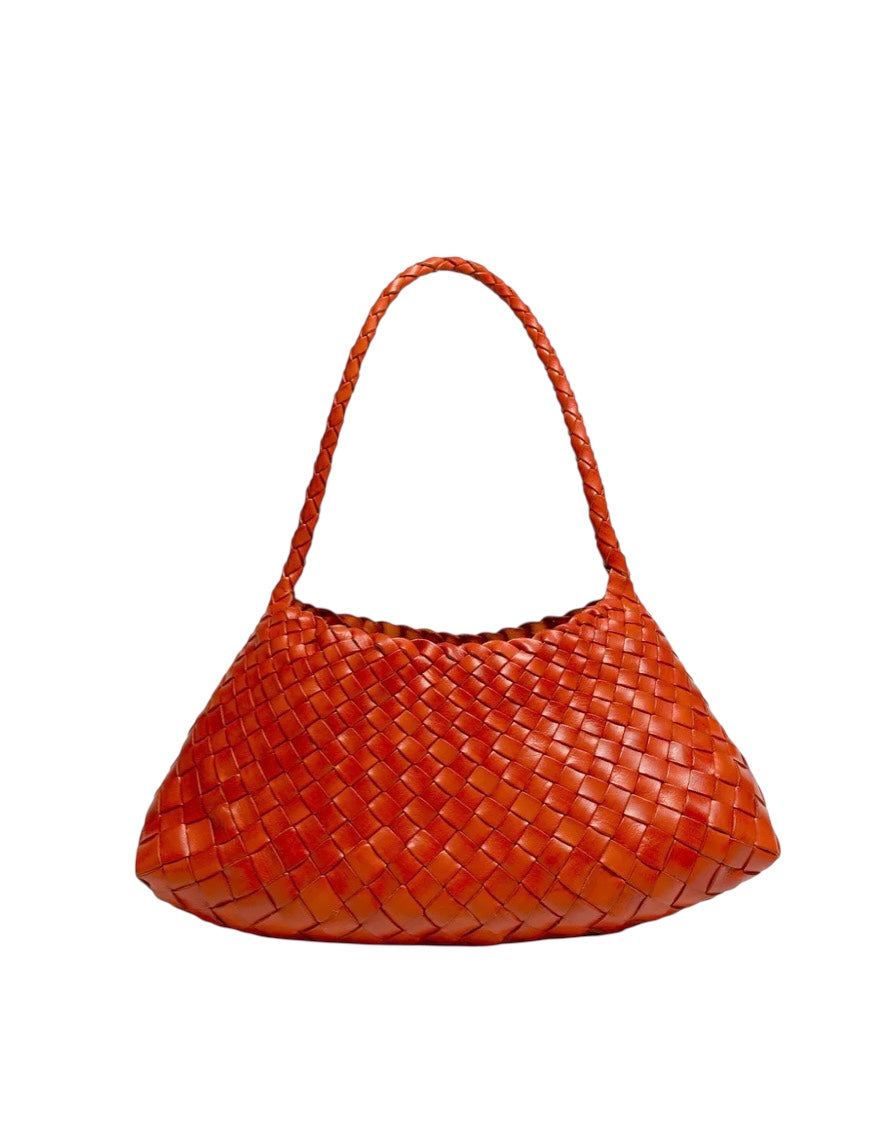 Small dark brown woven leather bag with a single shoulder strap, worn over the shoulder or by hand